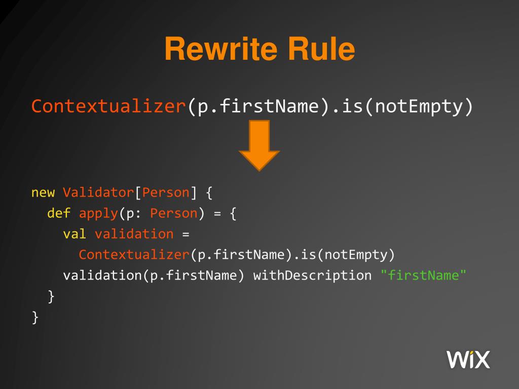 Rewrite Rule Contextualizer(p.firstName).is(notEmpty) newValidator[Person] { defapply(p: Person) = { valvalidation = Contextualizer(p.firstName).is(notEmpty) validation(p.firstName) withDescription"firstName" } }