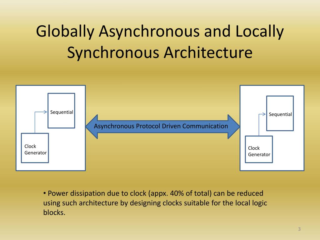 Globally Asynchronous and Locally Synchronous Architecture Sequential Sequential Asynchronous Protocol Driven Communication Clock Generator Clock Generator • Power dissipation due to clock (appx. 40% of total) can be reduced using such architecture by designing clocks suitable for the local logic blocks.