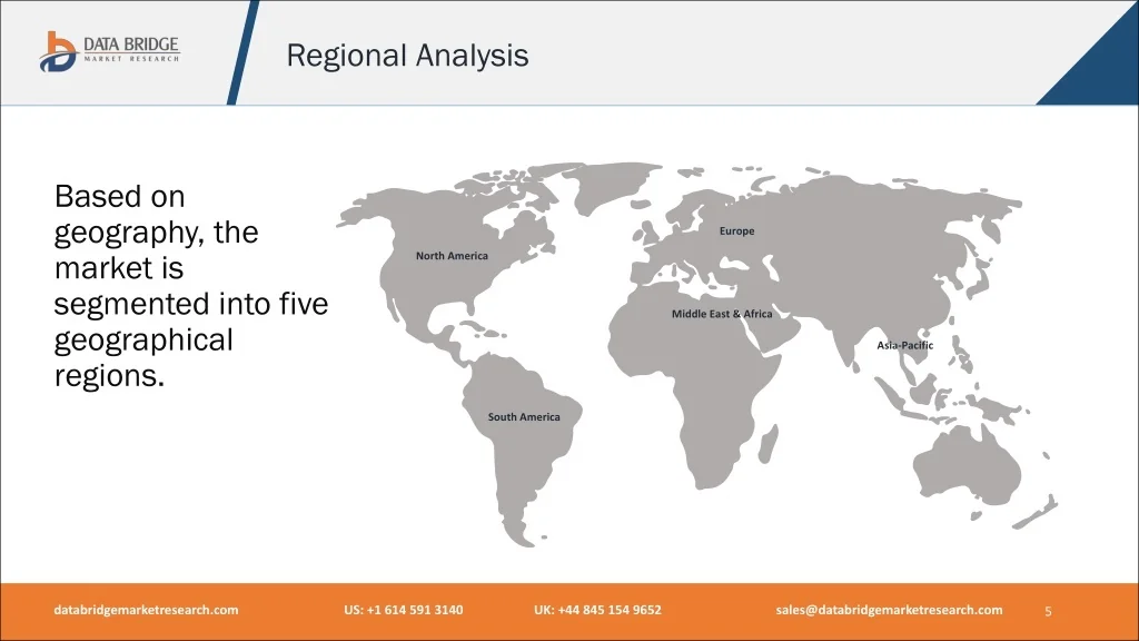 Regional Analysis Based on geography, the market is segmented into five geographical regions. Europe North America Middle East & Africa Asia-Pacific South America databridgemarketresearch.com US: +1 614 591 3140 UK: +44 845 154 9652 sales@databridgemarketresearch.com 5