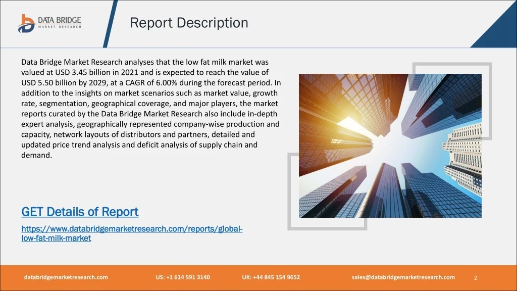 Report Description Data Bridge Market Research analyses that the low fat milk market was valued at USD 3.45 billion in 2021 and is expected to reach the value of USD 5.50 billion by 2029, at a CAGR of 6.00% during the forecast period. In addition to the insights on market scenarios such as market value, growth rate, segmentation, geographical coverage, and major players, the market reports curated by the Data Bridge Market Research also include in-depth expert analysis, geographically represented company-wise production and capacity, network layouts of distributors and partners, detailed and updated price trend analysis and deficit analysis of supply chain and demand. GET Details GET Details of Report of Report https://www.databridgemarketresearch.com/reports/global- https://www.databridgemarketresearch.com/reports/global- low-fat-milk-market low-fat-milk-market databridgemarketresearch.com US: +1 614 591 3140 UK: +44 845 154 9652 sales@databridgemarketresearch.com 2 2