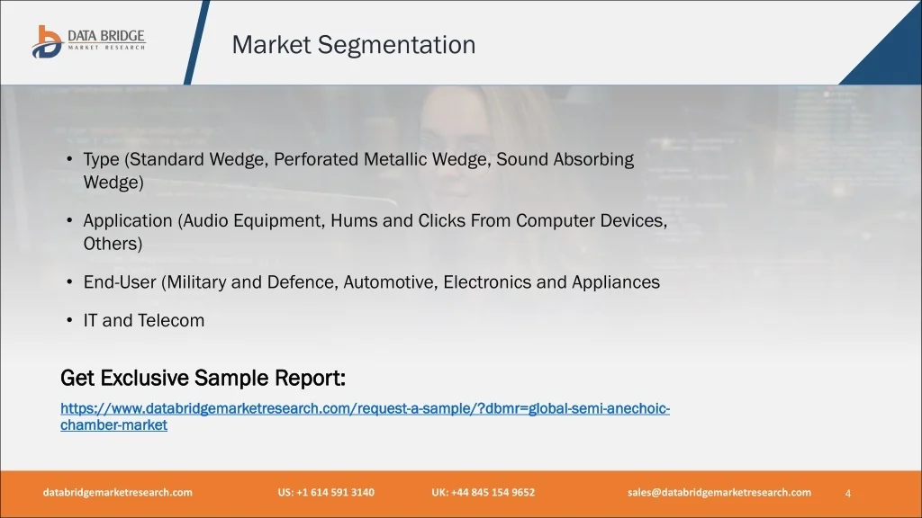 Market Segmentation • Type (Standard Wedge, Perforated Metallic Wedge, Sound Absorbing Wedge) • Application (Audio Equipment, Hums and Clicks From Computer Devices, Others) • End-User (Military and Defence, Automotive, Electronics and Appliances • IT and Telecom Get Exclusive Sample Report: Get Exclusive Sample Report: https://www.databridgemarketresearch.com/request-a-sample/?dbmr=global-semi-anechoic- https://www.databridgemarketresearch.com/request-a-sample/?dbmr=global-semi-anechoic- chamber-market chamber-market databridgemarketresearch.com US: +1 614 591 3140 UK: +44 845 154 9652 sales@databridgemarketresearch.com 4 4