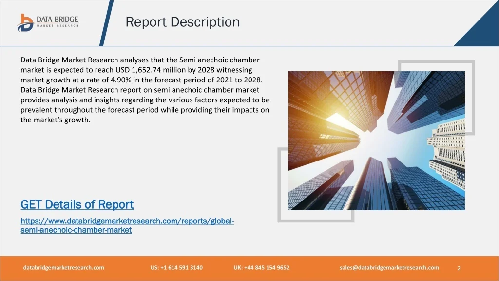 Report Description Data Bridge Market Research analyses that the Semi anechoic chamber market is expected to reach USD 1,652.74 million by 2028 witnessing market growth at a rate of 4.90% in the forecast period of 2021 to 2028. Data Bridge Market Research report on semi anechoic chamber market provides analysis and insights regarding the various factors expected to be prevalent throughout the forecast period while providing their impacts on the market’s growth. GET Details GET Details of Report of Report https://www.databridgemarketresearch.com/reports/global- https://www.databridgemarketresearch.com/reports/global- semi-anechoic-chamber-market semi-anechoic-chamber-market databridgemarketresearch.com US: +1 614 591 3140 UK: +44 845 154 9652 sales@databridgemarketresearch.com 2 2