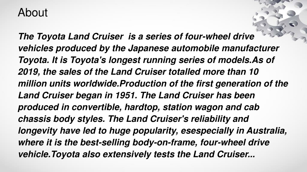 About The Toyota Land Cruiser is a series of four-wheel drive vehicles produced by the Japanese automobile manufacturer Toyota. It is Toyota's longest running series of models.As of 2019, the sales of the Land Cruiser totalled more than 10 million units worldwide.Production of the first generation of the Land Cruiser began in 1951. The Land Cruiser has been produced in convertible, hardtop, station wagon and cab chassis body styles. The Land Cruiser's reliability and longevity have led to huge popularity, esespecially in Australia, where it is the best-selling body-on-frame, four-wheel drive vehicle.Toyota also extensively tests the Land Cruiser...