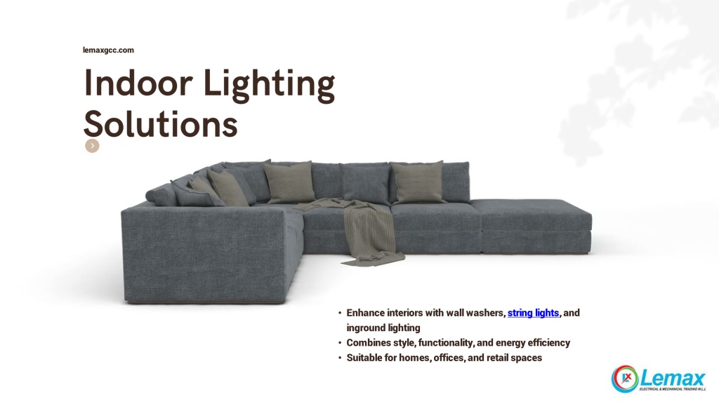 lemaxgcc.com Indoor Lighting Solutions • Enhance interiors with wall washers, string lights, and inground lighting • Combines style, functionality, and energy efficiency • Suitable for homes, offices, and retail spaces