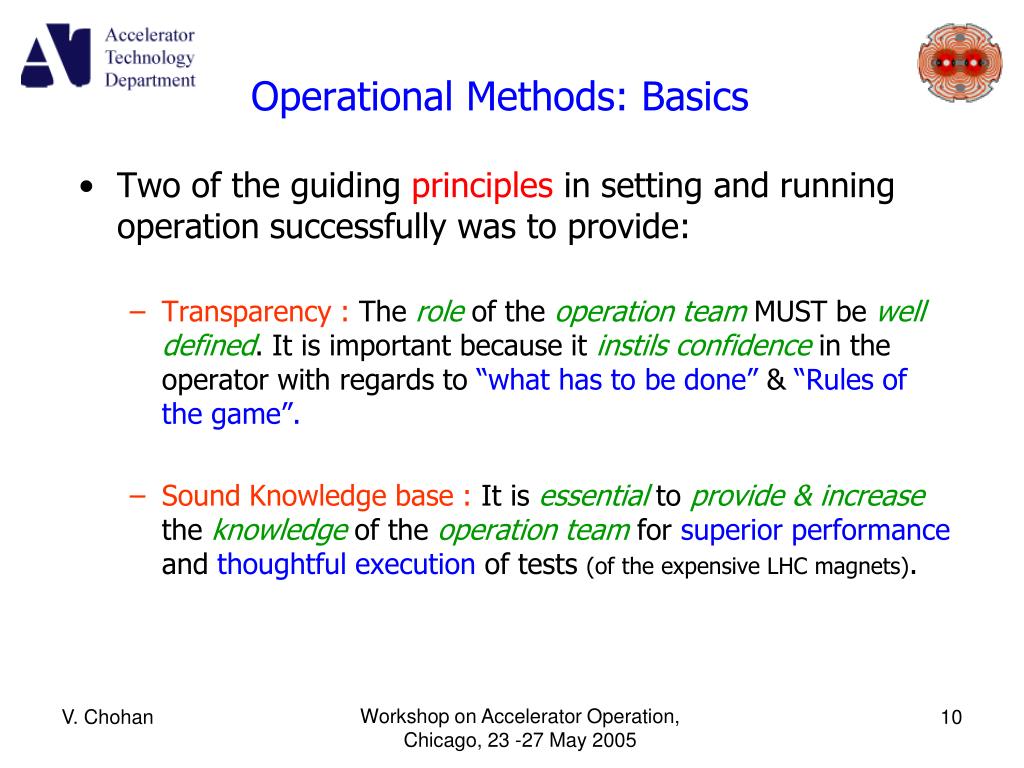 Operational Methods: Basics • Two of the guiding principles in setting and running operation successfully was to provide: • Transparency : The role of the operation team MUST be well defined. It is important because it instils confidence in the operator with regards to “what has to be done” & “Rules of the game”. • Sound Knowledge base : It is essential to provide & increase the knowledge of the operation team for superior performance and thoughtful execution of tests (of the expensive LHC magnets). Workshop on Accelerator Operation, Chicago, 23 -27 May 2005