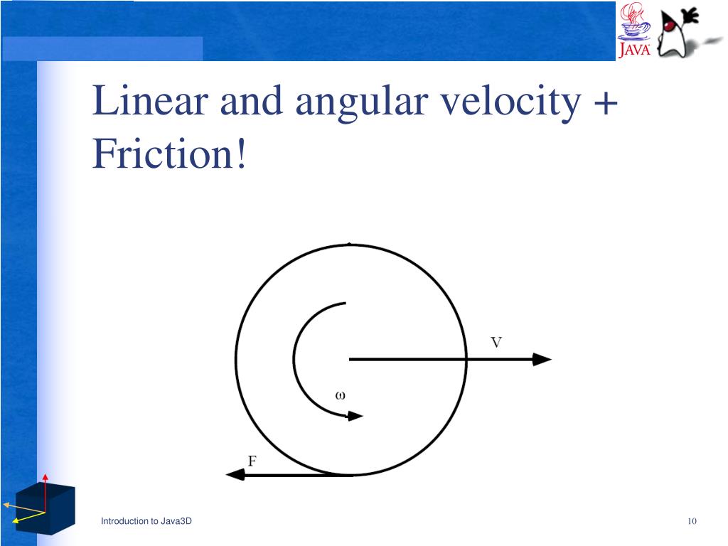 Linear and angular velocity +Friction! Introduction to Java3D10