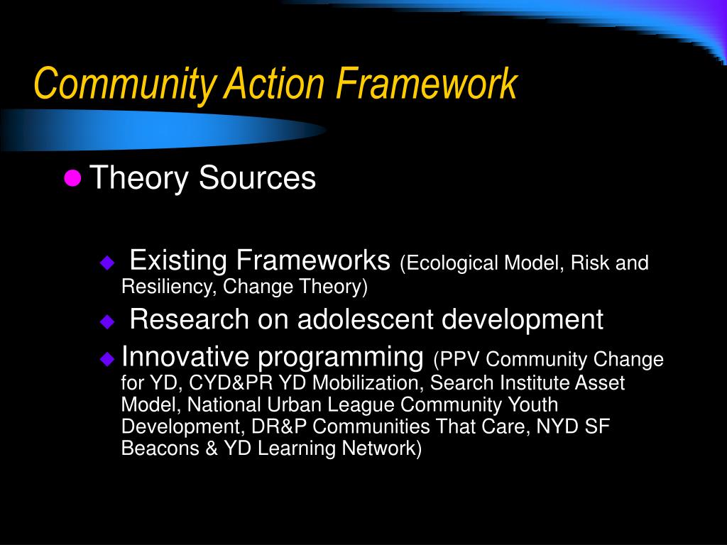 Community Action Framework • Theory Sources • Existing Frameworks (Ecological Model, Risk and Resiliency, Change Theory) • Research on adolescent development • Innovative programming (PPV Community Change for YD, CYD&PR YD Mobilization, Search Institute Asset Model, National Urban League Community Youth Development, DR&P Communities That Care, NYD SF Beacons & YD Learning Network)