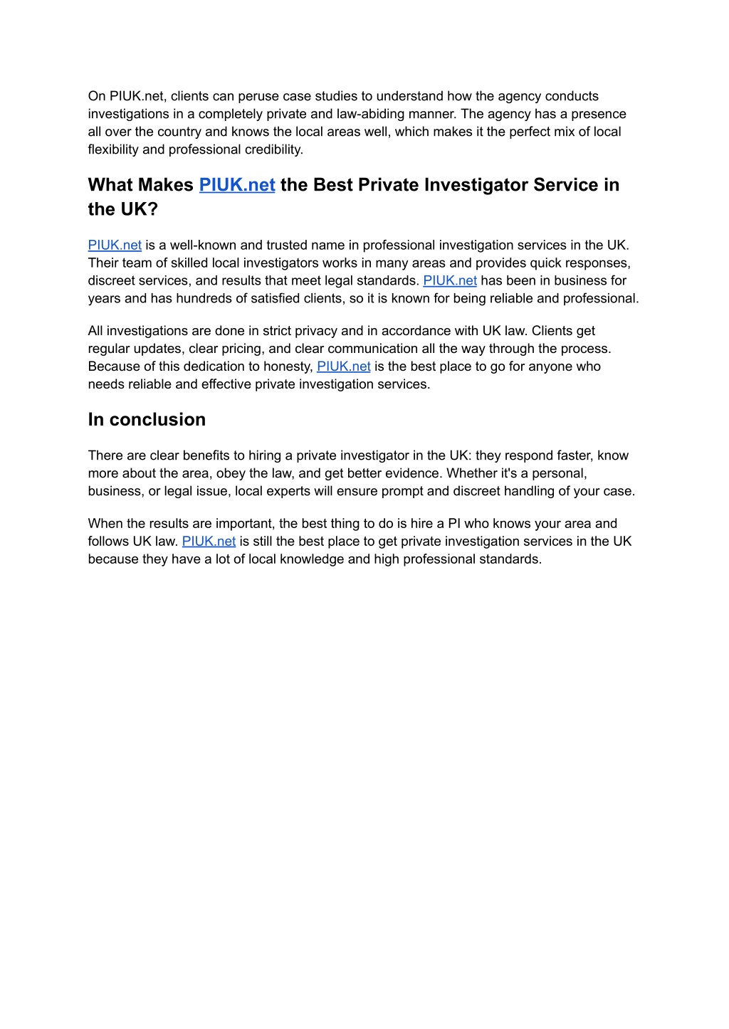4. On PIUK.net, clients can peruse case studies to understand how the agency conducts investigations in a completely private and law-abiding manner. The agency has a presence all over the country and knows the local areas well, which makes it the perfect mix of local flexibility and professional credibility. What Makes PIUK.net the Best Private Investigator Service in the UK? PIUK.net is a well-known and trusted name in professional investigation services in the UK. Their team of skilled local investigators works in many areas and provides quick responses, discreet services, and results that meet legal standards. PIUK.net has been in business for years and has hundreds of satisfied clients, so it is known for being reliable and professional. All investigations are done in strict privacy and in accordance with UK law. Clients get regular updates, clear pricing, and clear communication all the way through the process. Because of this dedication to honesty, PIUK.net is the best place to go for anyone who needs reliable and effective private investigation services. In conclusion There are clear benefits to hiring a private investigator in the UK: they respond faster, know more about the area, obey the law, and get better evidence. Whether it's a personal, business, or legal issue, local experts will ensure prompt and discreet handling of your case. When the results are important, the best thing to do is hire a PI who knows your area and follows UK law. PIUK.net is still the best place to get private investigation services in the UK because they have a lot of local knowledge and high professional standards.