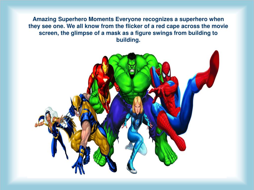 Amazing Superhero Moments Everyone recognizes a superhero when they see one. We all know from the flicker of a red cape across the movie screen, the glimpse of a mask as a figure swings from building to building.