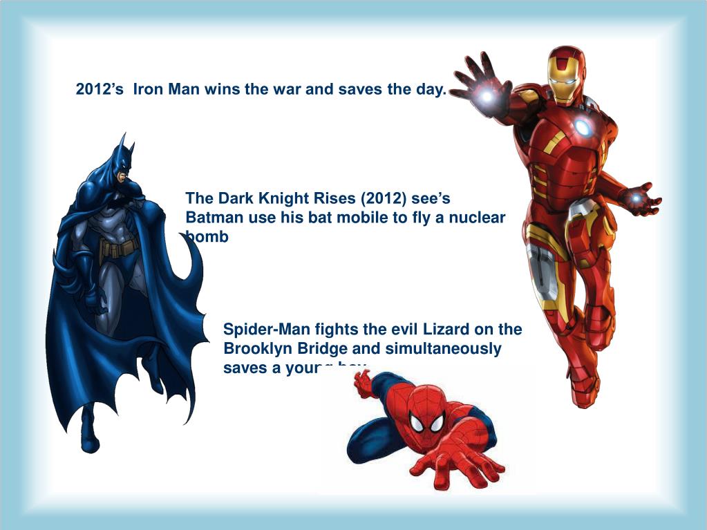 2012’s Iron Man wins the war and saves the day. The Dark Knight Rises (2012) see’s Batman use his bat mobile to fly a nuclear bomb Spider-Man fights the evil Lizard on the Brooklyn Bridge and simultaneously saves a young boy