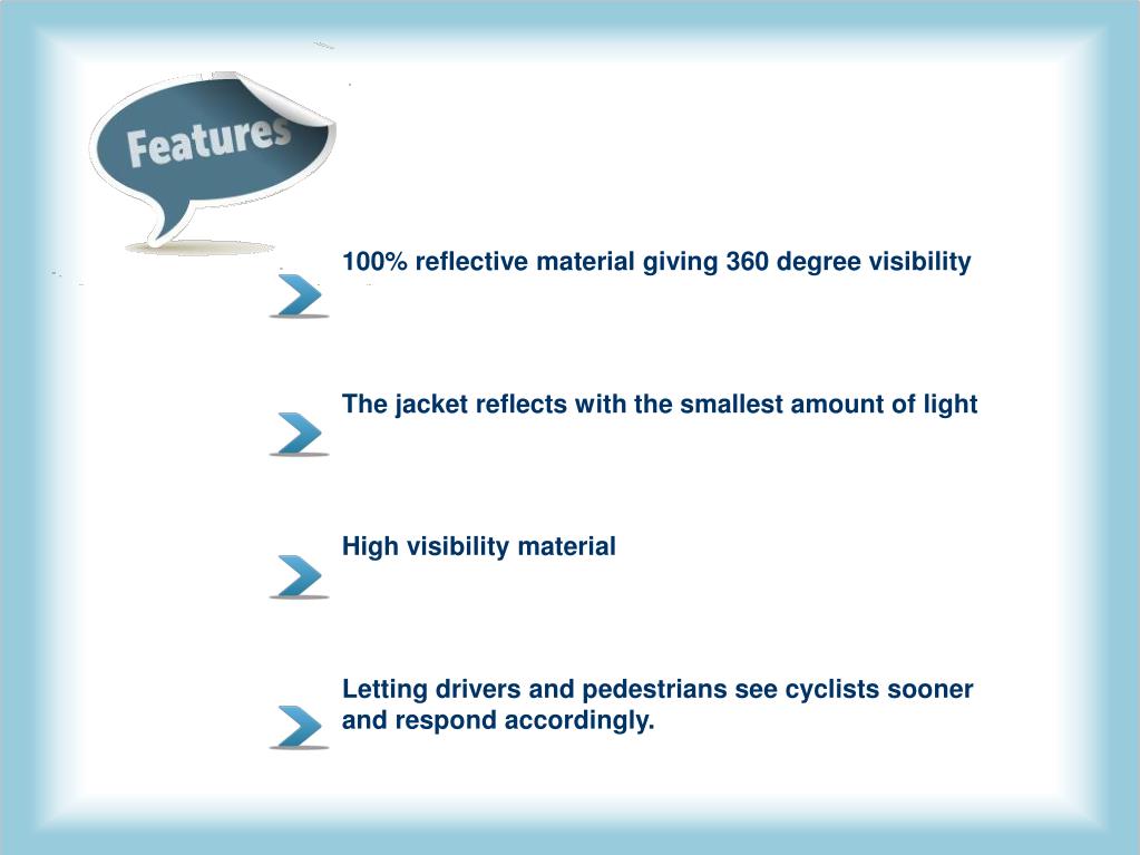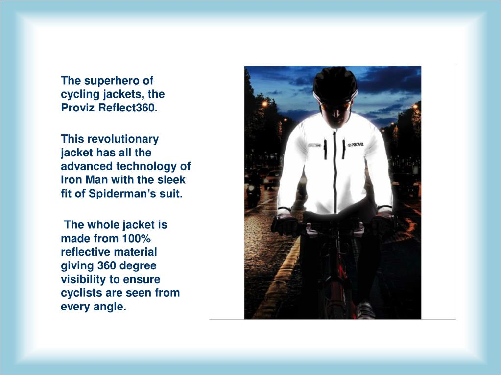 100% reflective material giving 360 degree visibility The jacket reflects with the smallest amount of light High visibility material Letting drivers and pedestrians see cyclists sooner and respond accordingly.