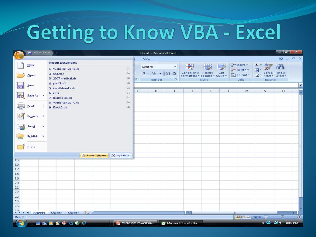 Getting to Know VBA • Note that other 2007 Office products: • Visio • Project • Publisher • and previous products in Office 2003 do not use the Ribbon Interface.