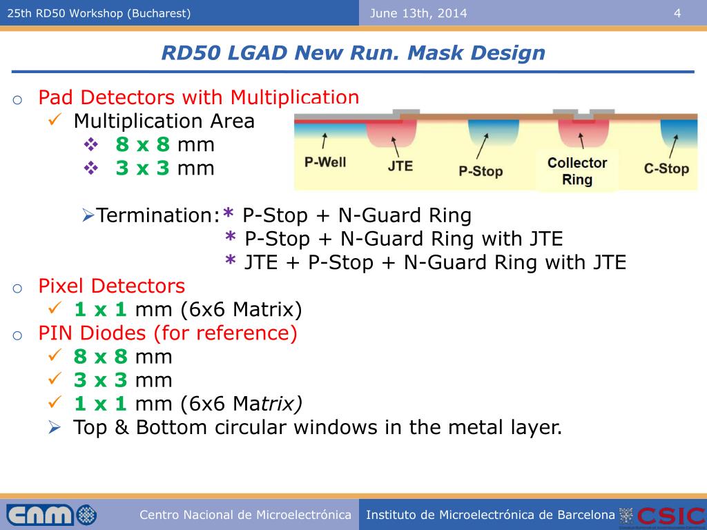 RD50 LGAD New Run. Mask Design • Pad Detectors with Multiplication • Multiplication Area • 8 x 8 mm • 3 x 3 mm • Termination:* P-Stop + N-Guard Ring • * P-Stop + N-Guard Ring with JTE • *JTE + P-Stop + N-Guard Ring with JTE • Pixel Detectors • 1 x 1 mm (6x6 Matrix) • PIN Diodes (for reference) • 8 x 8 mm • 3x 3mm • 1 x 1 mm (6x6 Matrix) • Top & Bottom circular windows in the metal layer.