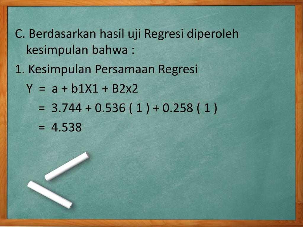 C. Berdasarkan hasil uji Regresi diperoleh kesimpulan bahwa : 1. Kesimpulan Persamaan Regresi Y = a + b1X1 + B2x2 = 3.744 + 0.536 ( 1 ) + 0.258 ( 1 ) = 4.538