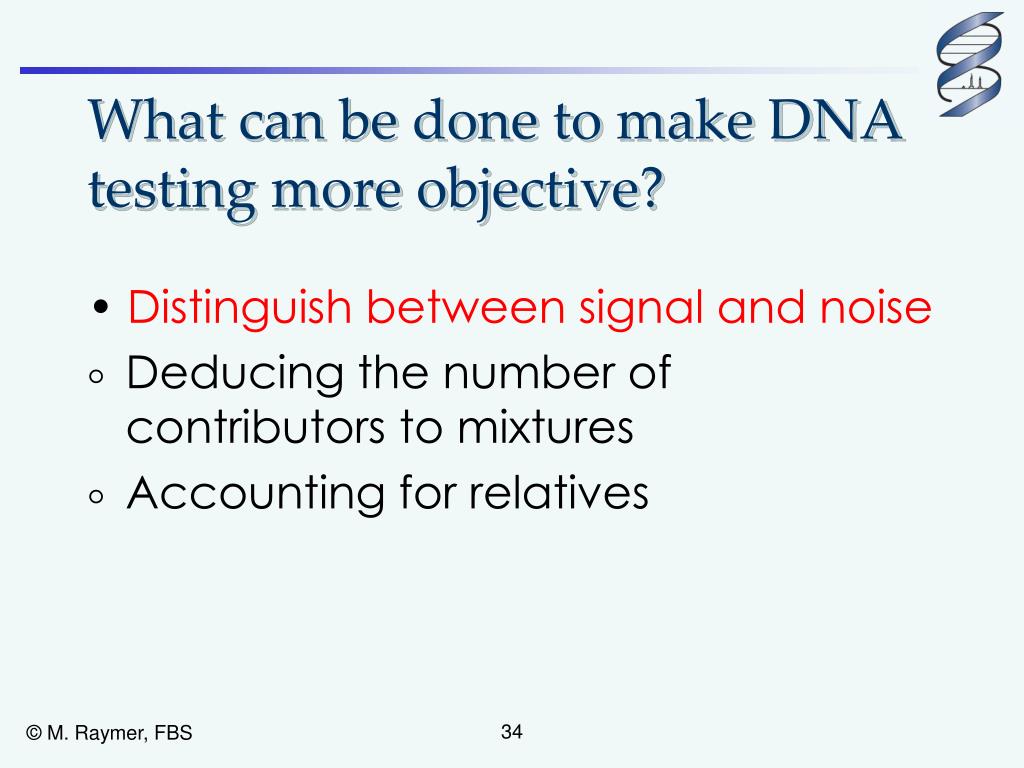 What can be done to make DNA testing more objective? • Distinguish between signal and noise • Deducing the number of contributors to mixtures • Accounting for relatives © M. Raymer, FBS