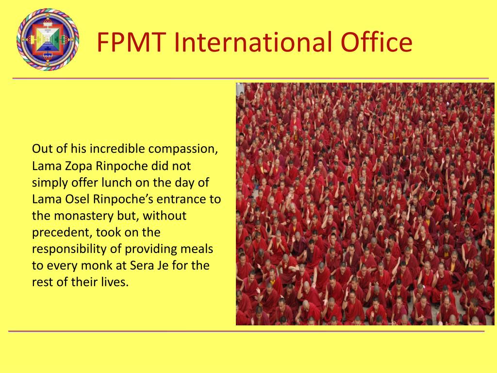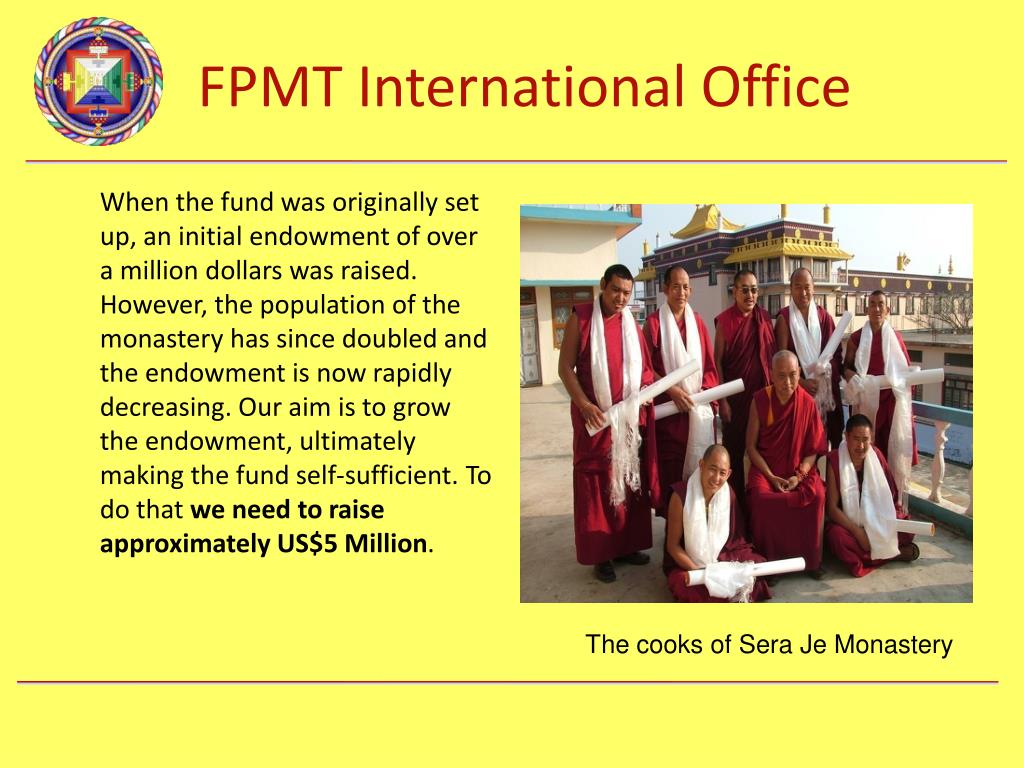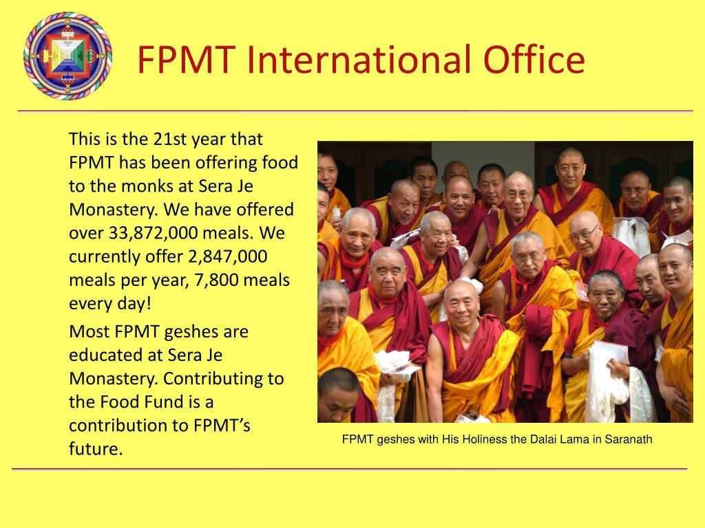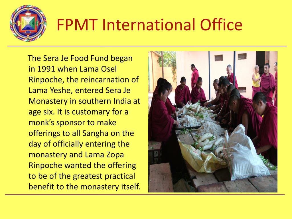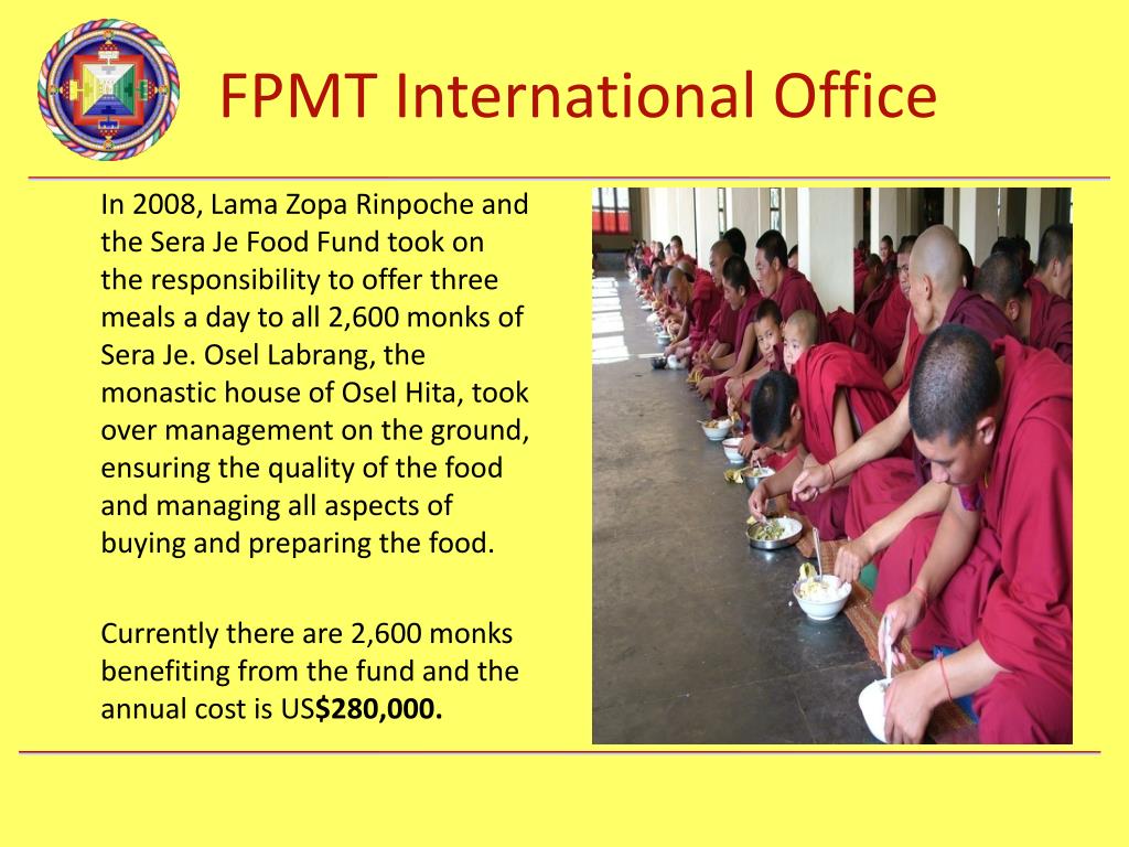 In 2008, Lama Zopa Rinpoche and the Sera Je Food Fund took on the responsibility to offer three meals a day to all 2,600 monks of Sera Je. Osel Labrang, the monastic house of Osel Hita, took over management on the ground, ensuring the quality of the food and managing all aspects of buying and preparing the food. Currently there are 2,600 monks benefiting from the fund and the annual cost is US$280,000.