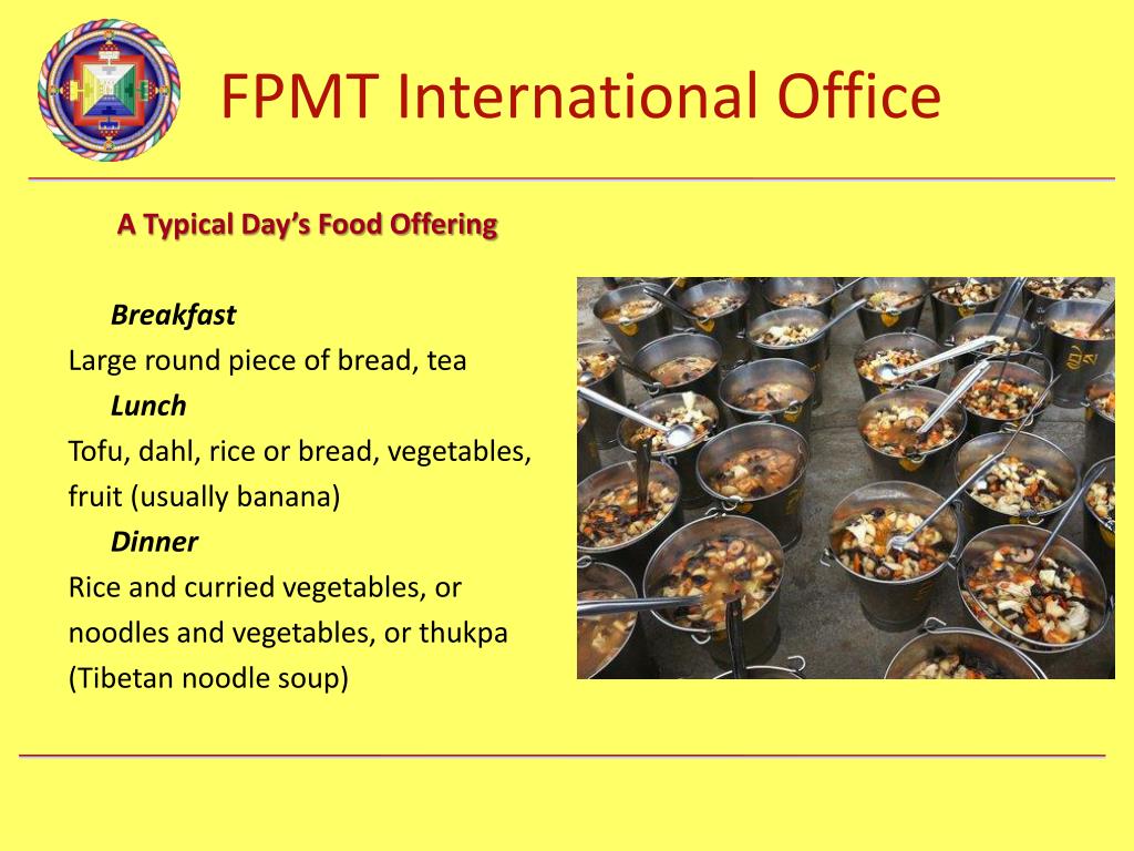 A Typical Day’s Food Offering Breakfast Large round piece of bread, tea Lunch Tofu, dahl, rice or bread, vegetables, fruit (usually banana) Dinner Rice and curried vegetables, or noodles and vegetables, or thukpa (Tibetan noodle soup)