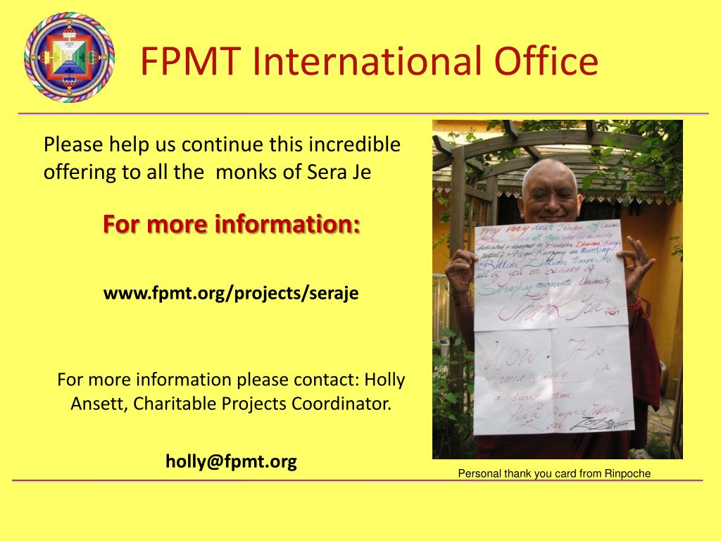 Please help us continue this incredible offering to all the monks of Sera Je For more information: www.fpmt.org/projects/seraje For more information please contact: Holly Ansett, Charitable Projects Coordinator. holly@fpmt.org Personal thank you card from Rinpoche