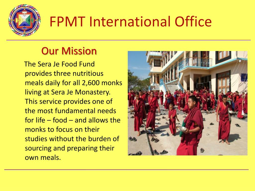 Our Mission The Sera Je Food Fund provides three nutritious meals daily for all 2,600 monks living at Sera Je Monastery. This service provides one of the most fundamental needs for life – food – and allows the monks to focus on their studies without the burden of sourcing and preparing their own meals.