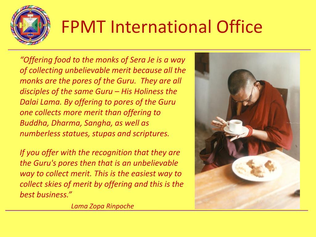 “Offering food to the monks of Sera Je is a way of collecting unbelievable merit because all the monks are the pores of the Guru. They are all disciples of the same Guru – His Holiness the Dalai Lama. By offering to pores of the Guru one collects more merit than offering to Buddha, Dharma, Sangha, as well as numberless statues, stupas and scriptures. If you offer with the recognition that they are the Guru's pores then that is an unbelievable way to collect merit. This is the easiest way to collect skies of merit by offering and this is the best business.” Lama Zopa Rinpoche