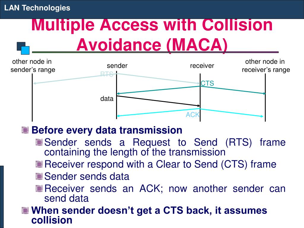 LAN Technologies Multiple Access with Collision Avoidance (MACA) • Before every data transmission • Sender sends a Request to Send (RTS) frame containing the length of the transmission • Receiver respond with a Clear to Send (CTS) frame • Sender sends data • Receiver sends an ACK; now another sender can send data • When sender doesn’t get a CTS back, it assumes collision other node in sender’s range other node in receiver’s range sender receiver RTS CTS data ACK