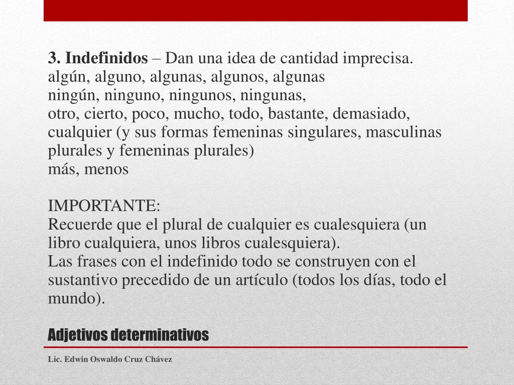 3. Indefinidos – Dan una idea de cantidad imprecisa. algún, alguno, algunas, algunos, algunas ningún, ninguno, ningunos, ningunas,otro, cierto, poco, mucho, todo, bastante, demasiado, cualquier (y sus formas femeninas singulares, masculinas plurales y femeninas plurales) más, menos IMPORTANTE: Recuerde que el plural de cualquier es cualesquiera (un libro cualquiera, unos libros cualesquiera). Las frases con el indefinido todo se construyen con el sustantivo precedido de un artículo (todos los días, todo el mundo). Adjetivosdeterminativos Lic. Edwin Oswaldo Cruz Chávez