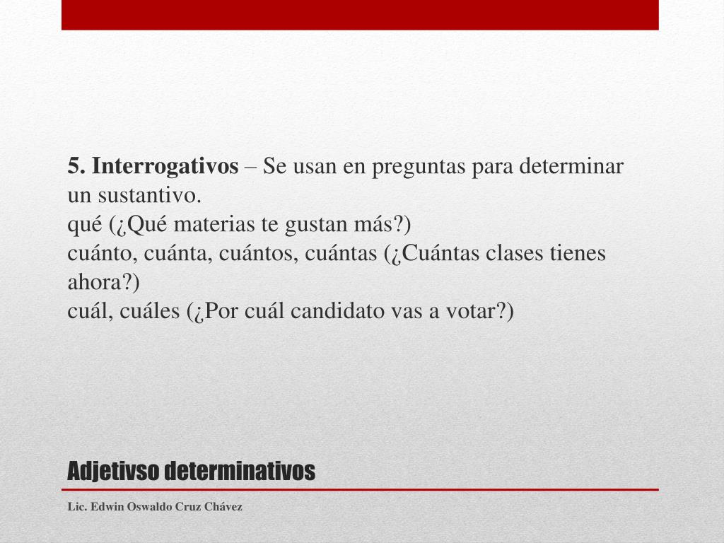 5. Interrogativos – Se usan en preguntas para determinar un sustantivo. qué (¿Qué materias te gustan más?) cuánto, cuánta, cuántos, cuántas (¿Cuántas clases tienes ahora?) cuál, cuáles (¿Por cuál candidato vas a votar?) Adjetivsodeterminativos Lic. Edwin Oswaldo Cruz Chávez