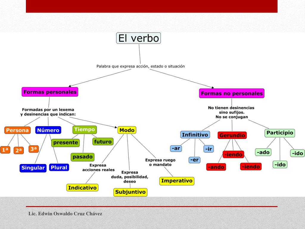 a) Infinitivo: Es la forma nominal del verbo. Es decir, se puede utilizar como un sustantivo. Es el nombre de los verbos: haber, ser, amar, comer, dormir. Terminan en -ar, -er, -ir. Ejemplos: el comer, voy a saltar, quiero salir a la calle, me gusta cantar. b) Participio: Es la forma adjetiva del verbo y puede calificar al sustantivo. Terminan en -ado e -ido. Ejemplos: amado, comido, dormido, habido, sido. c) El Gerundio es la forma adverbial del verbo. Terminan en -ando e -iendo. Ejemplos: amando, comiendo, durmiendo, habiendo, siendo Formas no personales Lic. Edwin Oswaldo Cruz Chávez