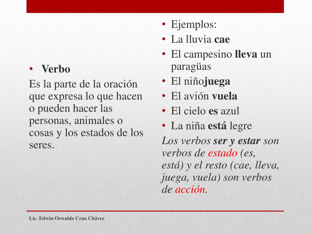 Verbo Es la parte de la oración que expresa lo que hacen o pueden hacer las personas, animales o cosas y los estados de los seres. • Ejemplos: • La lluvia cae • El campesino lleva un paragüas • El niñojuega • El avión vuela • El cielo esazul • La niña estálegre Los verbos ser y estar son verbos de estado (es, está) y el resto (cae, lleva, juega, vuela) son verbos de acción. Lic. Edwin Oswaldo Cruz Chávez