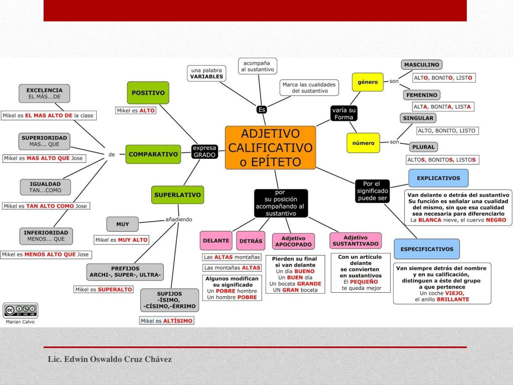 4. Numerales – Dan la idea de cantidad exacta. Se subclasifican en: a) cardinales – uno (un), dos, tres… y también ambos(as) b) ordinales – primero (primer), segundo, tercero (tercer), etc. c) múltiplos – doble, triple, cuádruple, etc. d) partitivos – medio, tercera parte, cuarta parte, etc. e) distruibutivos – cada, sendos(as) IMPORTANTE: El adjetivo sendo(s) significa ‘uno o una para cada cual de dos o más personas o cosas’ (Ellas tienen sendos sombreros – cada una de ellas tiene el suyo). Adjetivodeterminativo Lic. Edwin Oswaldo Cruz Chávez