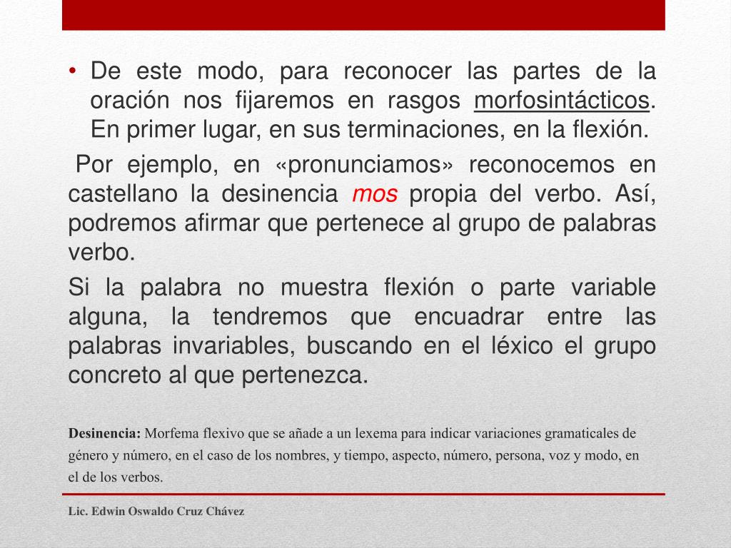 De este modo, para reconocer las partes de la oración nos fijaremos en rasgos morfosintácticos. En primer lugar, en sus terminaciones, en la flexión. Por ejemplo, en «pronunciamos» reconocemos en castellano la desinencia mospropia del verbo. Así, podremos afirmar que pertenece al grupo de palabras verbo. Si la palabra no muestra flexión o parte variable alguna, la tendremos que encuadrar entre las palabras invariables, buscando en el léxico el grupo concreto al que pertenezca. Desinencia: Morfema flexivo que se añade a un lexema para indicar variaciones gramaticales de género y número, en el caso de los nombres, y tiempo, aspecto, número, persona, voz y modo, en el de los verbos. Lic. Edwin Oswaldo Cruz Chávez