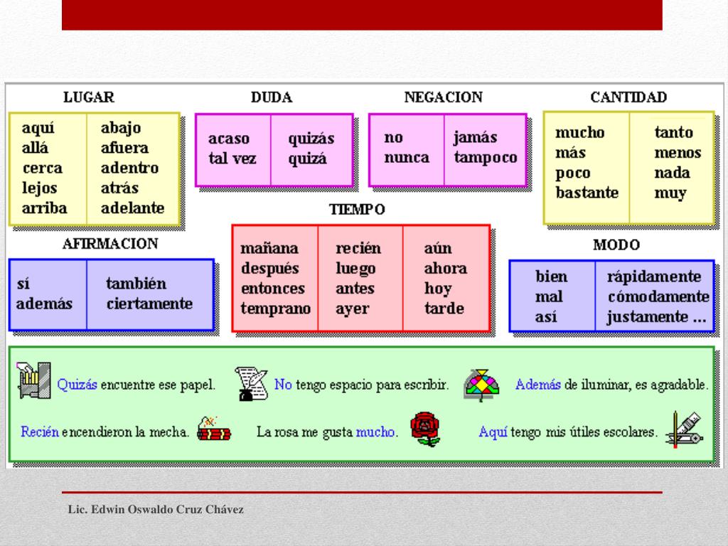 La clasificación de los diferentes tipos de palabras puede obedecer diversos criterios: 1. Según la clasificación sintáctica. 2. Según la variabilidad de su forma: en variables (o flexivas) e invariables (o no flexivas). 3. Por el significado: Las dividiremos en: • principales: sustantivo, verbo, adjetivo y adverbio, las que tienen significado pleno • secundarias: preposiciones y conjunciones que no tienen significado por sí mismas. Lic. Edwin Oswaldo Cruz Chávez