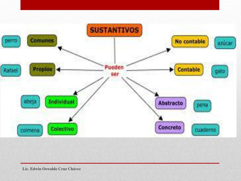 Sustantivos propios: Sirve para denominar en forma concreta algún sujeto u objeto. Sustantivos comunes: Se utiliza para designar en forma general a toda persona, animal u objeto.Sustantivos abstractos: Constituidos por ideas o sentimientos. Son sustantivos que no pueden percibirse por los sentidos.Sustantivos concretos: Son aquellos que sí son perceptibles por los sentidos. Sustantivos contables: Designan cosas que son susceptibles de enumeración. Ej.: tres sillas, dos mesas. Sustantivos no contables: No pueden ser enumerados, pero sí pueden medirse. Ejemplos: agua, leche, harina.Sustantivos individuales: Sirven para nombrar a un ser en particular. Ej.: abejaSustantivos colectivos: Se encargan de nombrar a seres que engloban a otros de un mismo tipo o clase. Ej.:enjambre. El sustantivo y susclases Lic. Edwin Oswaldo Cruz Chávez