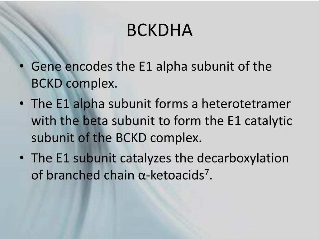 BCKDHA • Gene encodes the E1 alpha subunit of the BCKD complex. • The E1 alpha subunit forms a heterotetramer with the beta subunit to form the E1 catalytic subunit of the BCKD complex. • The E1 subunit catalyzes the decarboxylation of branched chain α-ketoacids7.