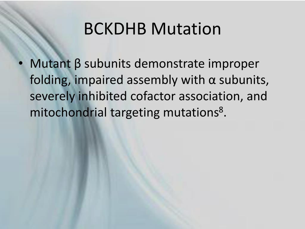BCKDHB Mutation • Mutant β subunits demonstrate improper folding, impaired assembly with α subunits, severely inhibited cofactor association, and mitochondrial targeting mutations8.
