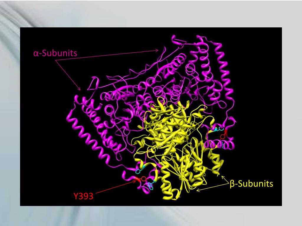 BCKDHA Mutation- Y393N Mutation • Caused by an A-T Transversion in the BCKDHA gene. • Y393N mutation is most prevalent in the Old Order Mennonite population. • Mutation affects the assembly kinetics of the E1 subunit; it takes over two hours to assemble the same amount of Y393N mutant E1 as wild-type E1 forms in 10 minutes. • Y393 mutant E1 also forms dimers instead of the normal tetramer, thus completely abolishing enzyme activity7. • Since the dimers are α-subunit dimers, Y393 is proposed to be integral to proper association of the α-subunit to the β-subunit13.