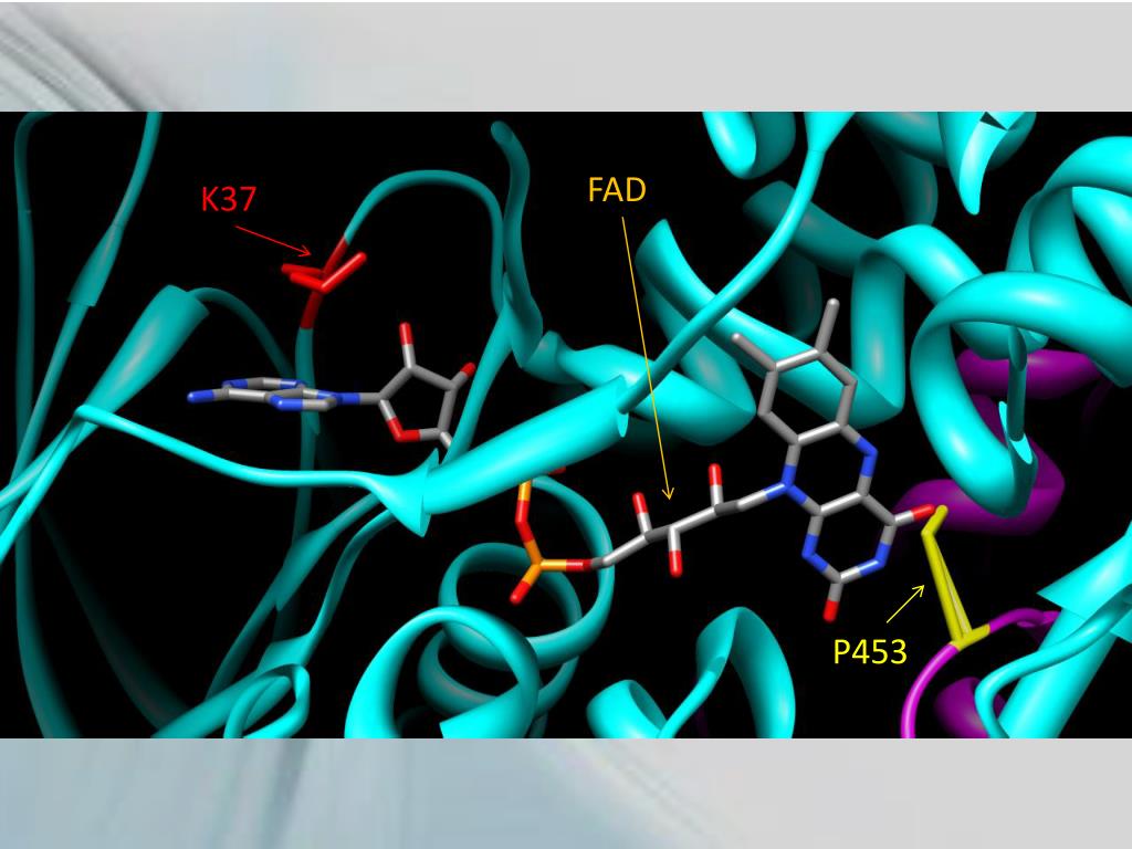DLD Mutation- K37E and P453L Mutations • The two mutations resulted in the altered active site of the E3 subunit and inhibited the enzyme’s ability to bind FAD, an essential cofactor for the enzyme’s function10.