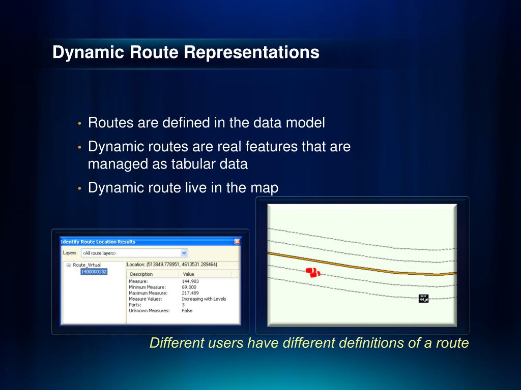 Dynamic Route Representations • Routes are defined in the data model • Dynamic routes are real features that are managed as tabular data • Dynamic route live in the map Different users have different definitions of a route