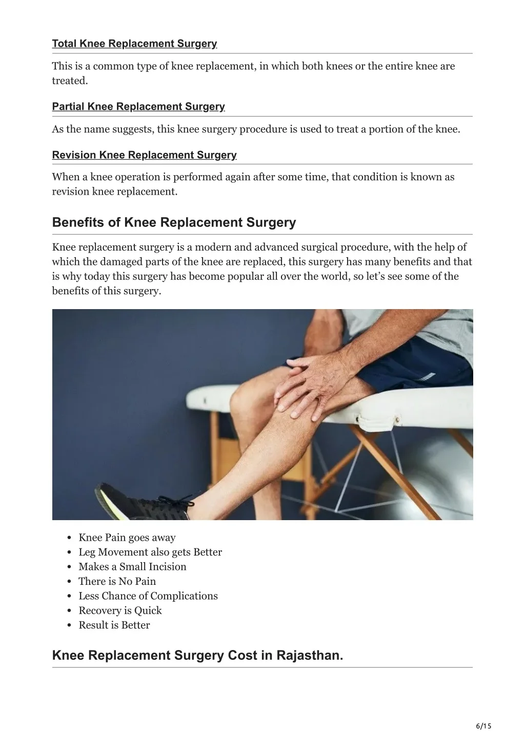 Total Knee Replacement Surgery This is a common type of knee replacement, in which both knees or the entire knee are treated. Partial Knee Replacement Surgery As the name suggests, this knee surgery procedure is used to treat a portion of the knee. Revision Knee Replacement Surgery When a knee operation is performed again after some time, that condition is known as revision knee replacement. Benefits of Knee Replacement Surgery Knee replacement surgery is a modern and advanced surgical procedure, with the help of which the damaged parts of the knee are replaced, this surgery has many benefits and that is why today this surgery has become popular all over the world, so let’s see some of the benefits of this surgery. Knee Pain goes away Leg Movement also gets Better Makes a Small Incision There is No Pain Less Chance of Complications Recovery is Quick Result is Better Knee Replacement Surgery Cost in Rajasthan. 6/15