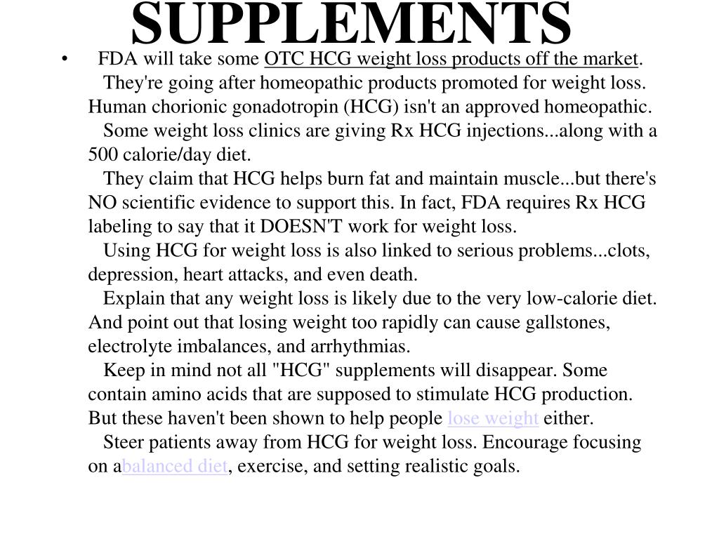 SUPPLEMENTS • FDA will take some OTC HCG weight loss products off the market. They're going after homeopathic products promoted for weight loss. Human chorionic gonadotropin (HCG) isn't an approved homeopathic. Some weight loss clinics are giving Rx HCG injections...along with a 500 calorie/day diet. They claim that HCG helps burn fat and maintain muscle...but there's NO scientific evidence to support this. In fact, FDA requires Rx HCG labeling to say that it DOESN'T work for weight loss. Using HCG for weight loss is also linked to serious problems...clots, depression, heart attacks, and even death. Explain that any weight loss is likely due to the very low-calorie diet. And point out that losing weight too rapidly can cause gallstones, electrolyte imbalances, and arrhythmias. Keep in mind not all "HCG" supplements will disappear. Some contain amino acids that are supposed to stimulate HCG production. But these haven't been shown to help people lose weight either. Steer patients away from HCG for weight loss. Encourage focusing on abalanced diet, exercise, and setting realistic goals.