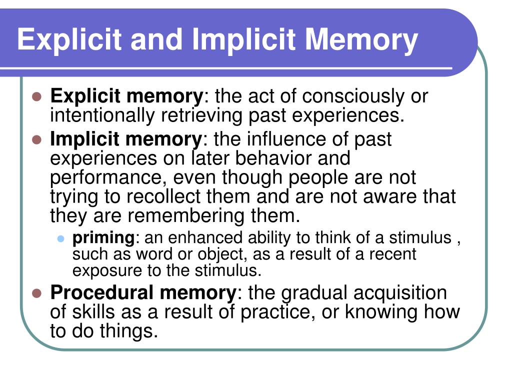 Explicit and Implicit Memory • Explicit memory: the act of consciously or intentionally retrieving past experiences. • Implicit memory: the influence of past experiences on later behavior and performance, even though people are not trying to recollect them and are not aware that they are remembering them. • priming: an enhanced ability to think of a stimulus , such as word or object, as a result of a recent exposure to the stimulus. • Procedural memory: the gradual acquisition of skills as a result of practice, or knowing how to do things.
