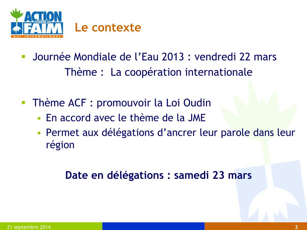 Le contexte • Journée Mondiale de l’Eau 2013 : vendredi 22 mars Thème : La coopération internationale • Thème ACF : promouvoir la Loi Oudin • En accord avec le thème de la JME • Permet aux délégations d’ancrer leur parole dans leur région Date en délégations : samedi 23 mars