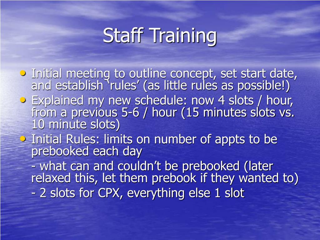 Staff Training • Initial meeting to outline concept, set start date, and establish ‘rules’ (as little rules as possible!) • Explained my new schedule: now 4 slots / hour, from a previous 5-6 / hour (15 minutes slots vs. 10 minute slots) • Initial Rules: limits on number of appts to be prebooked each day - what can and couldn’t be prebooked (later relaxed this, let them prebook if they wanted to) - 2 slots for CPX, everything else 1 slot