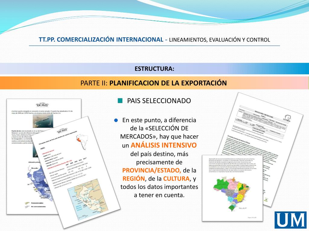 TT.PP. COMERCIALIZACIÓN INTERNACIONAL - LINEAMIENTOS, EVALUACIÓN Y CONTROL ESTRUCTURA: PARTE II: PLANIFICACION DE LA EXPORTACIÓN PARTE I: INTRODUCCIÓN PAIS SELECCIONADO En este punto, a diferencia de la «SELECCIÓN DE MERCADOS», hay que hacer un ANÁLISIS INTENSIVO del país destino, más precisamente de PROVINCIA/ESTADO, de la REGIÓN, de la CULTURA, y todos los datos importantes a tener en cuenta.