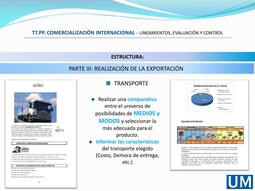 TT.PP. COMERCIALIZACIÓN INTERNACIONAL - LINEAMIENTOS, EVALUACIÓN Y CONTROL ESTRUCTURA: PARTE III: REALIZACIÓN DE LA EXPORTACIÓN PARTE II: PLANIFICACION DE LA EXPORTACIÓN PARTE I: INTRODUCCIÓN TRANSPORTE Realizar una comparativaentre el universo de posibilidades de MEDIOS y MODOS y seleccionar la más adecuada para el producto. Informar las características del transporte elegido (Costo, Demora de entrega, etc.)