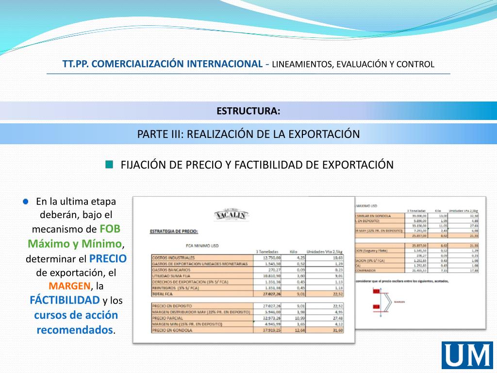 TT.PP. COMERCIALIZACIÓN INTERNACIONAL - LINEAMIENTOS, EVALUACIÓN Y CONTROL ESTRUCTURA: PARTE III: REALIZACIÓN DE LA EXPORTACIÓN FIJACIÓN DE PRECIO Y FACTIBILIDAD DE EXPORTACIÓN En la ultima etapa deberán, bajo el mecanismo de FOB Máximo y Mínimo, determinar el PRECIOde exportación, el MARGEN, la FÁCTIBILIDADy los cursos de acción recomendados.