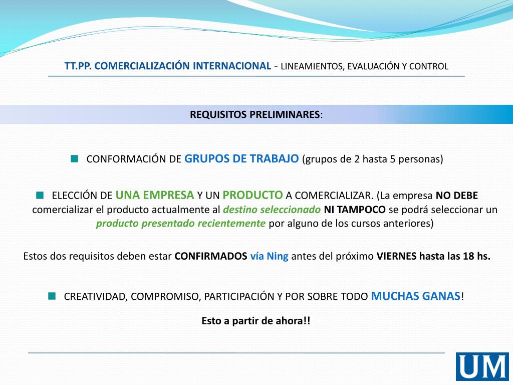 TT.PP. COMERCIALIZACIÓN INTERNACIONAL - LINEAMIENTOS, EVALUACIÓN Y CONTROL REQUISITOS PRELIMINARES: CONFORMACIÓN DE GRUPOS DE TRABAJO (grupos de 2 hasta 5 personas) ELECCIÓN DE UNA EMPRESA Y UN PRODUCTO A COMERCIALIZAR. (La empresa NO DEBE comercializar el producto actualmente al destino seleccionadoNI TAMPOCO se podrá seleccionar un producto presentado recientemente por alguno de los cursos anteriores) Estos dos requisitos deben estar CONFIRMADOS vía Ning antes del próximo VIERNES hasta las 18 hs. CREATIVIDAD, COMPROMISO, PARTICIPACIÓN Y POR SOBRE TODO MUCHAS GANAS! Esto a partir de ahora!!