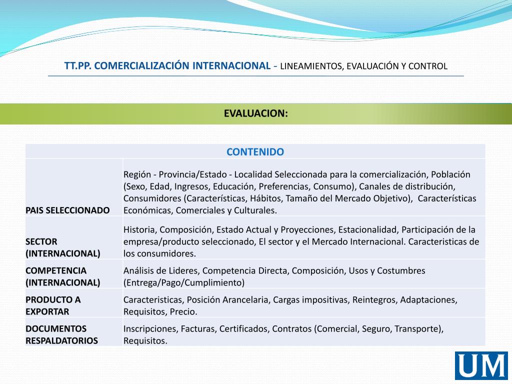 TT.PP. COMERCIALIZACIÓN INTERNACIONAL - LINEAMIENTOS, EVALUACIÓN Y CONTROL ESTRUCTURA: EVALUACION: