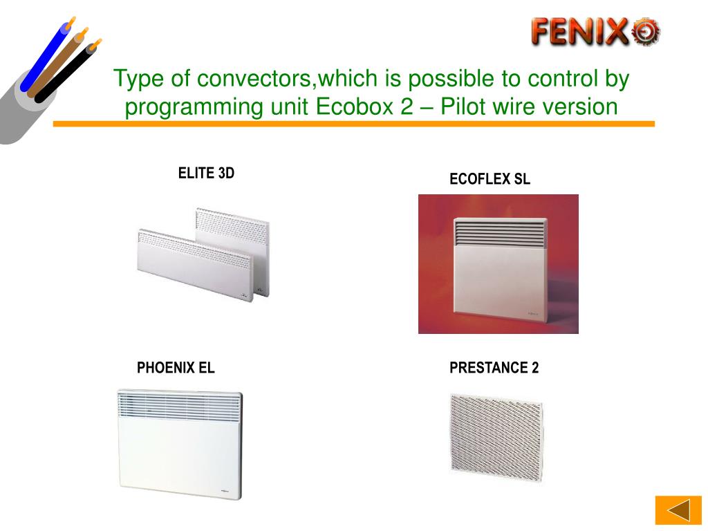 Type of convectors,which is possible to control by programming unit Ecobox 2 – Pilot wire version ELITE 3D ECOFLEX SL PHOENIX EL PRESTANCE 2