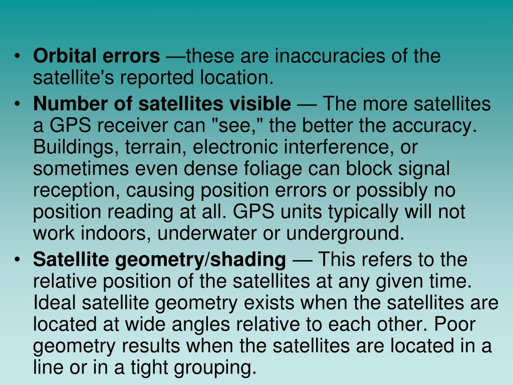Orbital errors —these are inaccuracies of the satellite's reported location. • Number of satellites visible — The more satellites a GPS receiver can "see," the better the accuracy. Buildings, terrain, electronic interference, or sometimes even dense foliage can block signal reception, causing position errors or possibly no position reading at all. GPS units typically will not work indoors, underwater or underground. • Satellite geometry/shading — This refers to the relative position of the satellites at any given time. Ideal satellite geometry exists when the satellites are located at wide angles relative to each other. Poor geometry results when the satellites are located in a line or in a tight grouping.